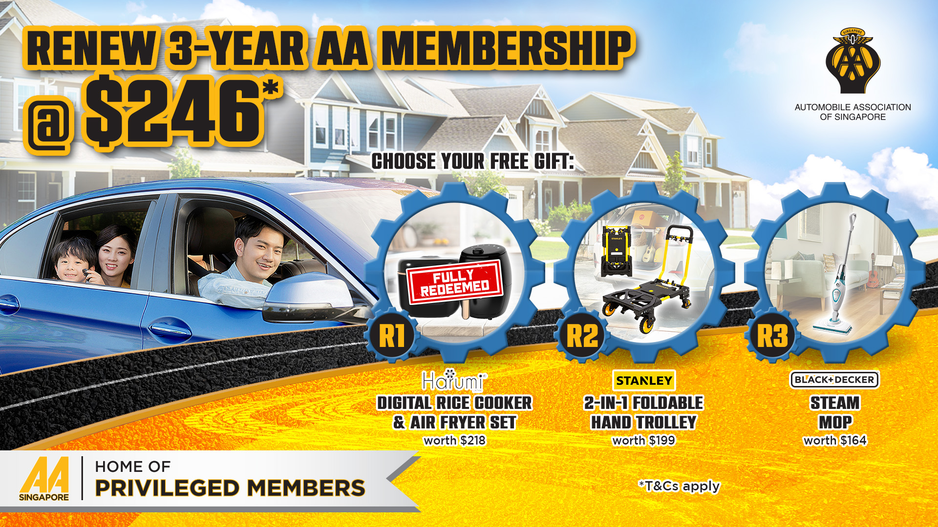 This AA Membership promotion is available for renewals only | The above AA Membership promotion is not applicable for on-the-spot signup with Roadside Assistance/Recovery services team | All prices quoted for Membership renewals are inclusive of GST | Gift will be available for redemption at AA Centre — 2 Kung Chong Road, #04-01, Singapore 159140 (while stocks last) | For Harumi gift’s defects, Harumi gift exchange’s terms and conditions apply. Product’s warranty covers 1-year for electronics parts and 6-months for battery. Visit: https://grunn.sg/terms-conditions/ or email to [email protected]. | Harumi Service Centre: Blk 9002 Tampines St 93 #02-74, Tampines Industrial Park A, Singapore 528863. Contact: 6848 9290 | For Halo Collective’s warranty is valid for 2 years from date of redemption | Blackout period: 26 January 2026 – 16 February 2026 , redemption, warranty claims and services are not applicable during this period | For Halo Collective enquiries WhatsApp: +65 8017 7166 or email [email protected] | Halo Collective Rejuvenation Package will be available for redemption at— 2 Kung Chong Road, #01-02, Singapore 159140 (while stocks last) | AAS and Halo Collective reserves the right to interpret, amend, modify, suspend, or terminate any promotion or coupon at its sole discretion without prior notice | AAS shall not be liable for any issues, disputes, or responsibilities arising from the redemption | For Black+Decker gift defects, Stanley Black & Decker product warranty’s terms and conditions apply | For Stanley Black & Decker warranty information enquiry, contact: +65 6201 3421 or email to [email protected]. Stanley Black & Decker Service Centre: 31 Ubi Road 1 #07-01A Annex Building, Singapore 408694. By appointment only | Gourmet Chef and Phoenix Gold’s warranty is valid for 3 months from date of redemption | For Gourmet Chef and Phoenix Gold’s gift defects, contact: +65 6742 1771 or email to [email protected]. JML Singapore Service Centre: 10 Changi South Lane #01-02, Singapore 486162 | JIMMY’s warranty is valid for 12 months from date of redemption | Register your JIMMY product warranty with your AA Membership number at Jimmy website: www.jimmy.com.sg | For Jimmy’s gift defects, contact: +65 9649 1579 or email to [email protected] to make an appointment with Jimmy Service Centre: 1 North Coast Avenue #05-07, 1 North Coast, Singapore 737663 | Due to global logistical issues, AA reserves the right to extend the redemption date without prior notification | AA Singapore reserves the right to amend the promotion(s), terms and conditions, and substitute gift(s) with item(s) of similar value without prior notice | Membership Promotion valid from 1 October 2025 – 6 January 2026.