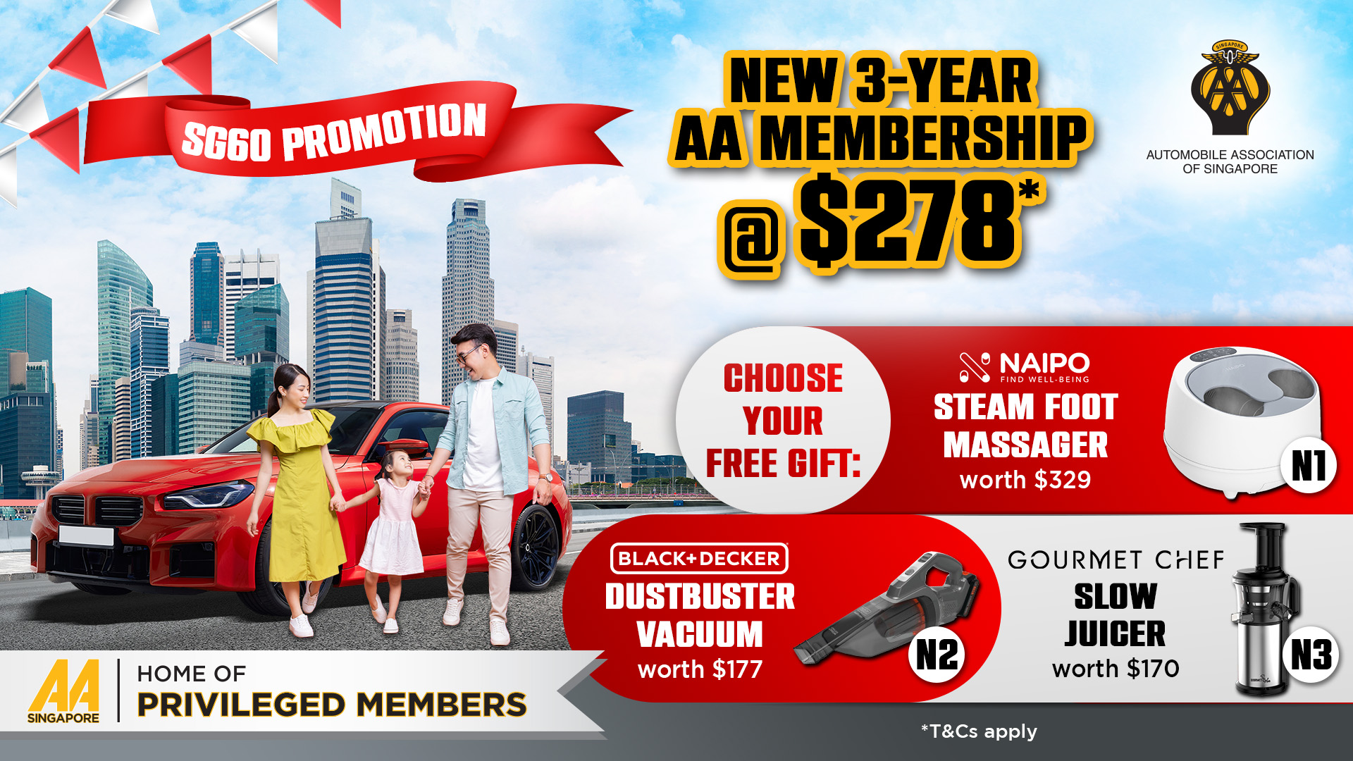 This AA Membership promotion is available for new signups only | The above AA Membership promotion is not applicable for on-the-spot signup with Roadside Assistance/Recovery services team | All prices quoted for Membership sign-ups are inclusive of GST | Gift will be available for redemption at AA Centre — 2 Kung Chong Road, #04-01, Singapore 159140 (while stocks last) ) | For Halo Collective’s warranty is valid for 2 years from date of redemption | Blackout period: 26 January 2026 – 16 February 2026 , redemption, warranty claims and services are not applicable during this period | For Halo Collective enquiries WhatsApp: +65 8017 7166 or email [email protected] | Halo Collective Rejuvenation Package will be available for redemption at— 2 Kung Chong Road, #01-02, Singapore 159140 (while stocks last) | AAS and Halo Collective reserves the right to interpret, amend, modify, suspend, or terminate any promotion or coupon at its sole discretion without prior notice | AAS shall not be liable for any issues, disputes, or responsibilities arising from the redemption | Korea King’s warranty is valid for 30 days from date of redemption | For Korea King’s defects, contact: +65 6742 1771 or email to [email protected]. JML Singapore Service Centre: 10 Changi South Lane #01-02, Singapore 486162 | For Black+Decker gift defects, Stanley Black & Decker product warranty’s terms and conditions apply | For Stanley Black & Decker warranty information enquiry, contact: +65 6201 3421 or email to [email protected]. Stanley Black & Decker Service Centre: 31 Ubi Road 1 #07-01A Annex Building, Singapore 408694.By appointment only | Sukhatara’s warranty is valid for 30 days from date of redemption | For Sukhatara’s gift defects, WhatsApp AA Membership: +65 9779 3028 or email [email protected]. AA Membership Customer Service Counter: 2 Kung Chong Road #04-01 AA Centre, Singapore 159140 | Gourmet Chef’s warranty is valid for 3 months from date of redemption | For Gourmet Chef’s gift defects, contact: +65 6742 1771 or email to [email protected]. JML Singapore Service Centre: 10 Changi South Lane #01-02, Singapore 486162 | Due to global logistical issues, AA reserves the right to extend the redemption date without prior notification | AA Singapore reserves the right to amend the promotion(s), terms and conditions, and substitute gift(s) with item(s) of similar value without prior notice | Membership Promotion valid from 1 October 2025 – 6 January 2026.